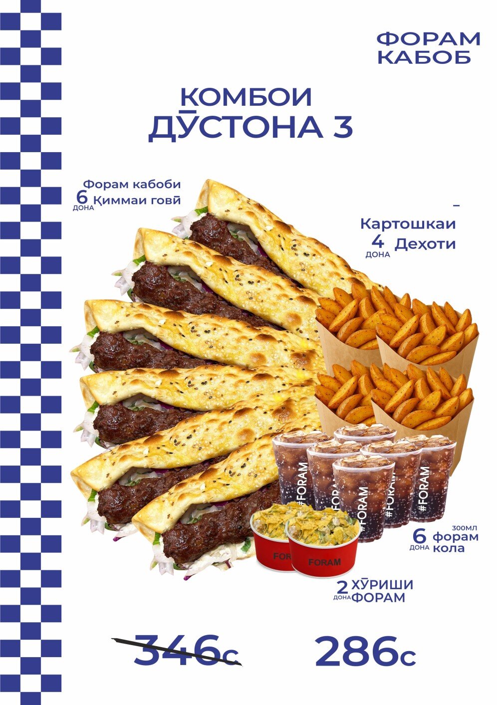 Форам кебаб говяжий-6шт,картошка по деревенский-4шт,Салат Форам-2шт,Форам кола 300мл-6шт